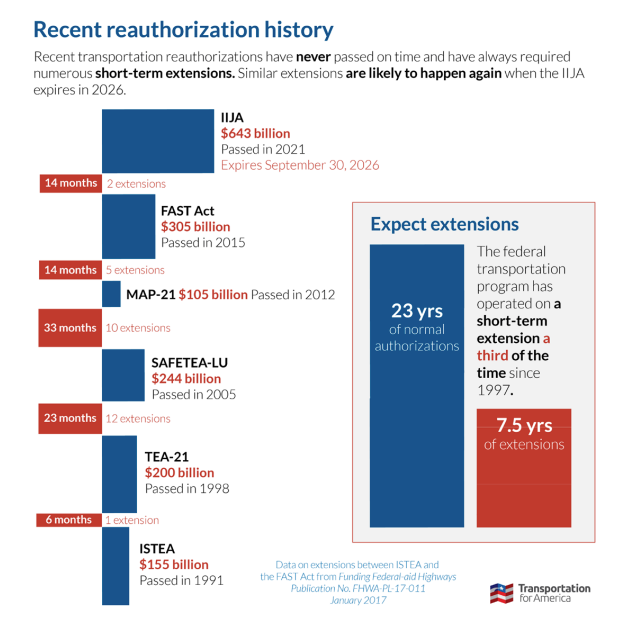Whether from press releases from trade groups, testimony in early hearings before Congress on reauthorization, or just conversations here and there, it has somehow become the conventional wisdom that we’ll see a new transportation law pass in September 2026 when the Infrastructure Investment and Jobs Act expires. Sure, there might be a short extension while Congress hammers out some details in the fall, but “transportation has always been a bipartisan issue,” and “our country’s infrastructure is too important,” and “they came together last time to pass historic amounts of funding for highways, transit, and rail, so they’ll definitely be able to do that again.”