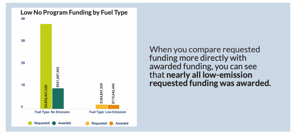 Despite the change, our Greener Fleets report from 2023 demonstrated that the demand for low-emission buses was so low in fiscal year 2022 that the newly added minimum set-aside couldn’t be reached—even with the Biden administration awarding funds to almost every low-emission bus applicant.